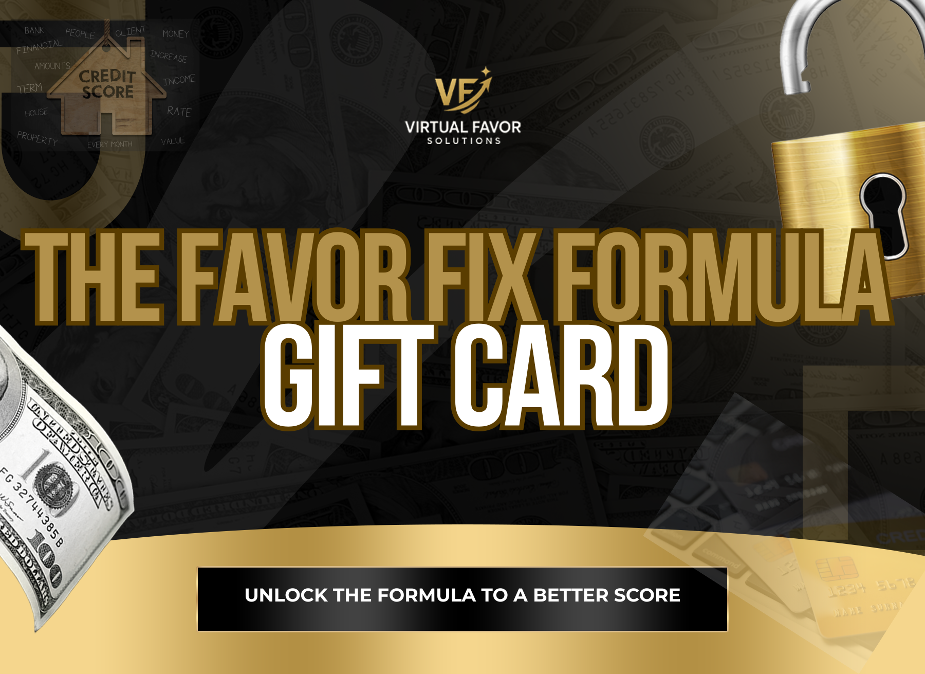 Give the gift of a fresh financial start. The Favor Fix Formula Gift Card can be used toward credit repair services, digital products, templates, and more. Unlock the formula to a better score.